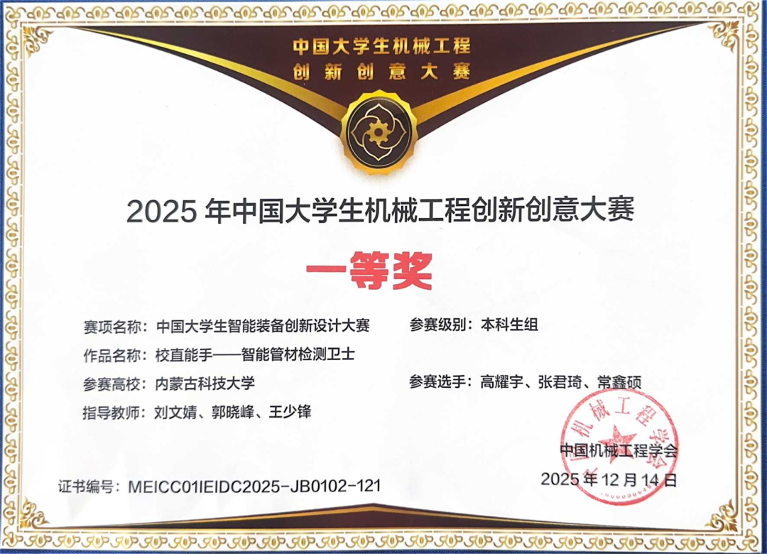 本届大赛共收到有效作品1570件,经过函评和在线答辩两轮筛选,共计428件作品进入决赛。赛事采用“海报讲解+现场答辩”的双环节评审形式,邀请全国智能装备领域高校专家学者与行业资深人士组成评审团,从创新创意、技术攻坚深度、实际应用价值、功能落地效果及社会辐射影响等多维度开展公正严谨评审。最终,我院学生团队作品《校直能手—智能管材检测卫士》斩获国家级一等奖。该团队由机械工程学院2023级过程装备与控制工程专业高耀宇、机械设计制造及其自动化专业张君琦等同学组成,在刘文婧、郭晓峰、王少锋老师的指导下,凭借突破性集成技术、高精度检测表现,以及自主研发的小型化、自定心、自主爬行机器人核心优势,从众多佳作中脱颖而出。