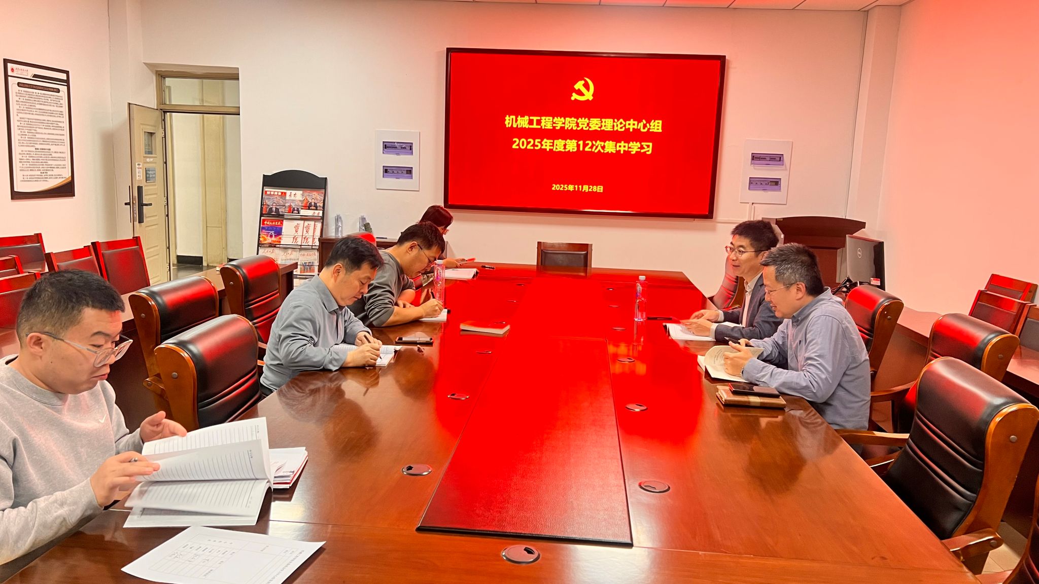 2025年11月28日上午,机械工程学院党委理论学习中心组在腾飞楼C211室召开了2025年度第12次集中学习会议。本次学习由学院党委书记黄成钢主持,全体中心组成员参加了会议。