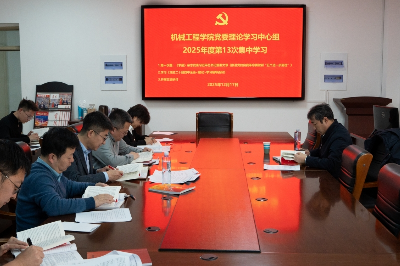 2025年12月17日下午,机械工程学院在腾飞楼C211会议室召开党委理论学习中心组(扩大)学习会议,专题学习党的二十届四中全会精神。会议由学院党委书记黄成钢主持。校党委副书记、校长韩永全出席会议,学院党委理论学习中心组成员、各党支部书记参加学习。