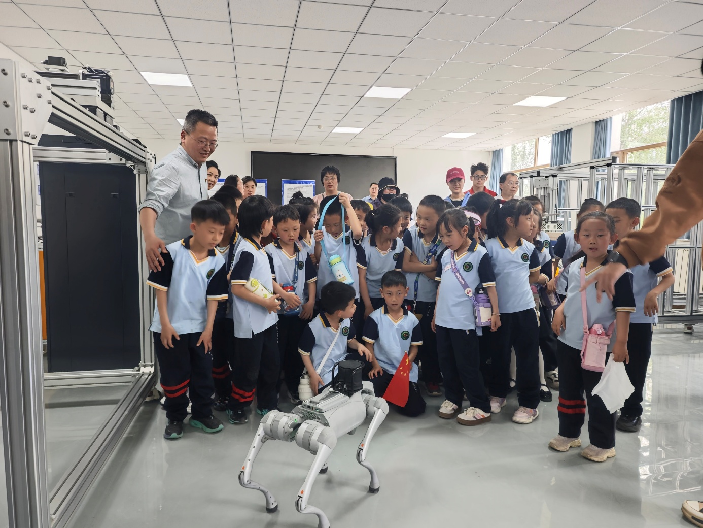 活动当天,在学院师生的热情接待下,小学生们首先来到智能制造实验室,亲身体验了由机器人、机器狗等先进设备组成的智能制造系统。在现场讲解员的引导下,同学们观看了机器人自动化操作的全过程。六轴工业机器人在编程控制下,精准执行搬运、装配等任务,引起了同学们的阵阵惊叹。“原来机器人还能这样工作,太神奇了!”一位小学生兴奋地说道。