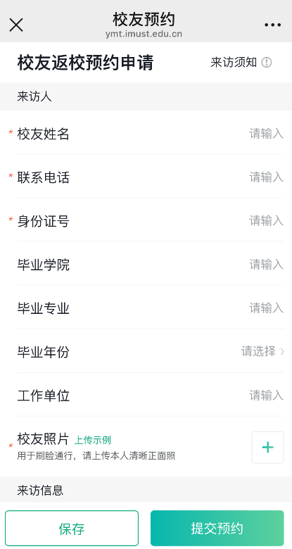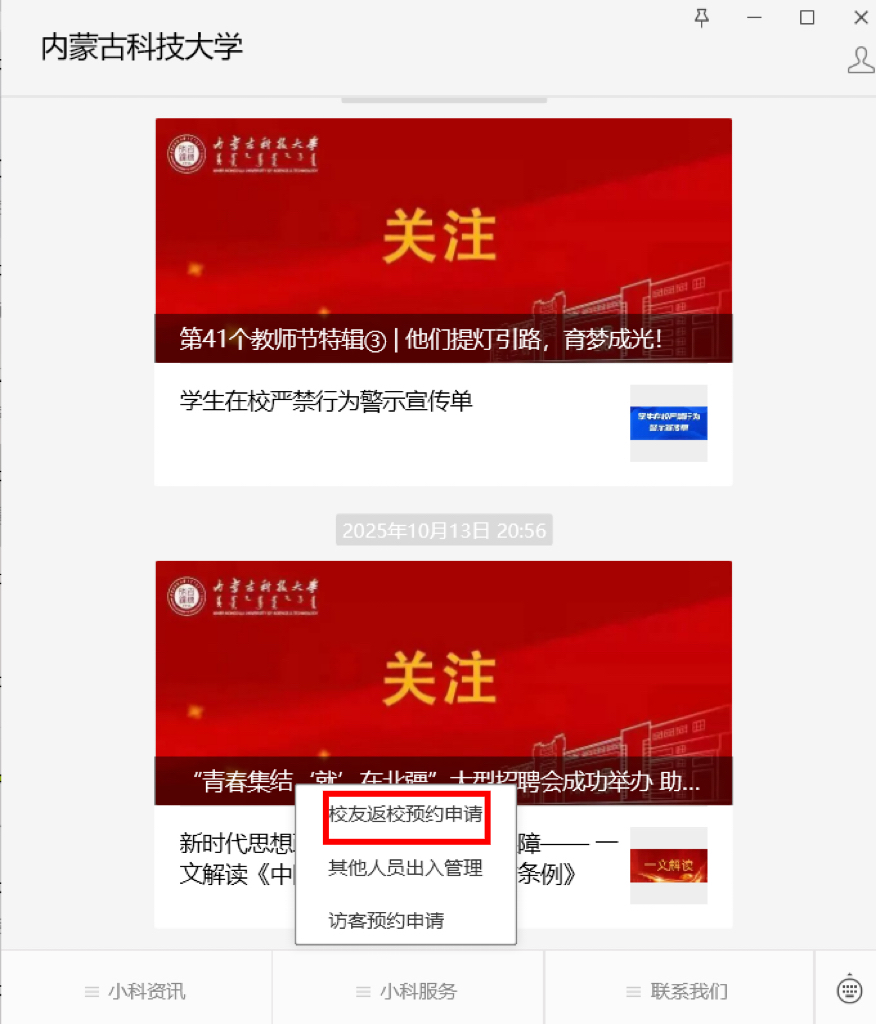 1、来访校友可关注“内蒙古科技大学微信公众号”,点击“小科服务—校友入校预约”,按要求填写并提交来访预约申请。